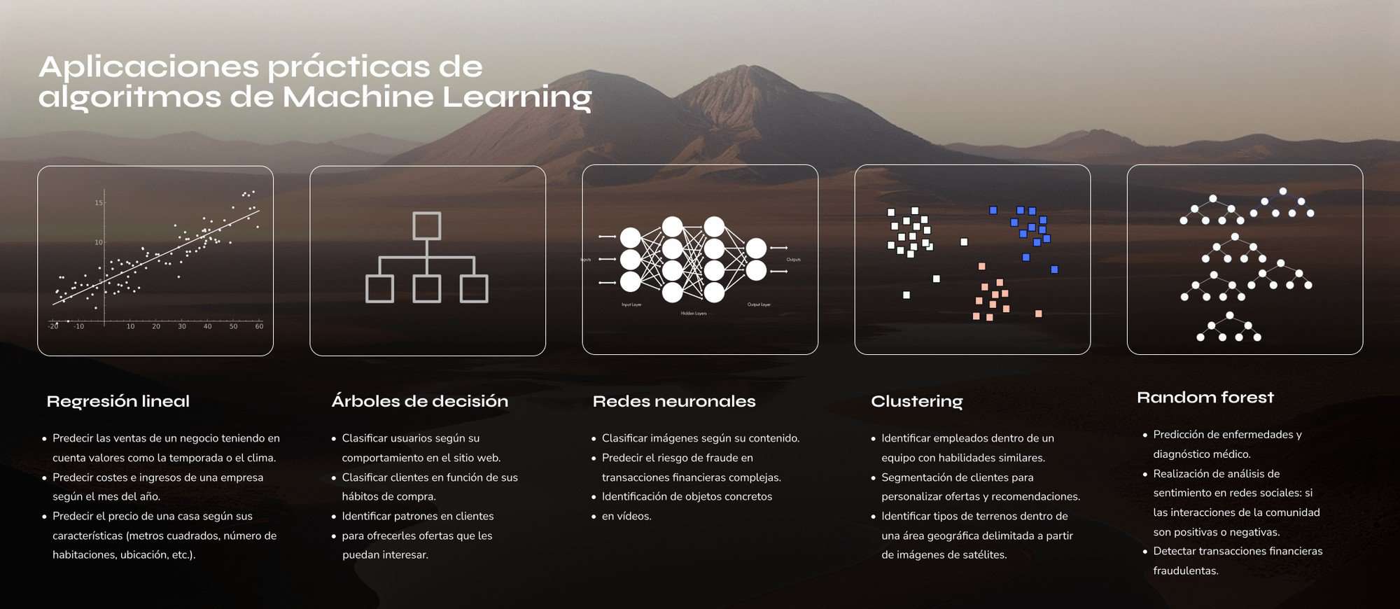 Con esta base, es pertinente mencionar que existen diversos algoritmos que impulsan el Machine Learning: en el siguiente apartado, abordaremos 5 de más destacados que no solo son la columna vertebral de muchas aplicaciones modernas, sino que también son esenciales para comprender la profundidad y el alcance de esta tecnología.